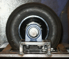 I finished the last of the four Plummer block wheel bearing supports. They were made out of 35mm x 15mm metal box section, and would support the bearing high enough off the chassis for the wheels to protrude through to the ground. There also needed to be some way of adjusting the position of the wheels to allow the chains to be tensioned, so I elongated the mounting holes and made a bracket that secured to one mounting bolt. With the aid of an adjusting nut, the bearing could be moved backwards or forwards until the chain was tensioned. |