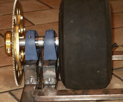 Here I mounted a drive sprocket on one end, and the wheel at the other, with two Plummer block bearings supporting the shaft in the middle. It was a compromise between space and rigidity, but there weren't too many alternative given the motor and ram positions.