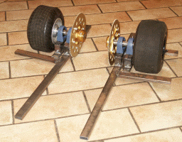 I finished the last of the four Plummer block wheel bearing supports. They were made out of 35mm x 15mm metal box section, and would support the bearing high enough off the chassis for the wheels to protrude through to the ground. There also needed to be some way of adjusting the position of the wheels to allow the chains to be tensioned, so I elongated the mounting holes and made a bracket that secured to one mounting bolt. With the aid of an adjusting nut, the bearing could be moved backwards or forwards until the chain was tensioned. |