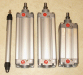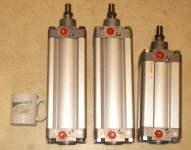 Tuesday 14th January 2003I took a day off work to visit Norgren's factory in Farnham. I had been talking with their quality manager Ben, who had offered me the chance of going through their bins for surplus items. This was an offer I couldn't resist. Even if I only found the odd small fitting, it would be a useful exercise to see the inside of a pneumatics factory. When I arrived we had a chat, and then they pointed me towards a pallet full of boxes that had been returned to Norgren for one reason or another. Ben offered me anything on the pallet because they would be thrown in the bin shortly. It was like Christmas all over again! On the pallet I found three 100mm bore cylinders with different strokes, and a number of other odd fittings. Each one of these cylinders would cost in the order of 180 pounds, so I left the factory very happy. In the pictures below you can see the relative size of the new rams compared to the old one, and a tea cup!
