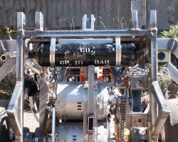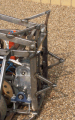 Saturday 22nd March 2003I tested out the pneumatics as best I could today, given that I didn't have all the components like a high flow rate regulator, and valve controller. Instead I connected a few trailing wires to a couple of the relevant valves, and ran a long piece of pipe from my CO2 gas bottle to the buffer tank. By connecting a battery to the trailing wires I could fire the pneumatics while standing a safe distance away from the Hog. Initially the flipper shot a couple of go kart tyres a long way into the air, but its response in trying to self right was a little disappointing. I had based the pneumatics on the robot M2, which solidly threw itself back onto its wheels, whereas the Hog certainly was not throwing itself anywhere. I did a bit of head scratching and then wondered if the high flow rate valves were "soft starting". These valves had to be operated by a 10 bar gas feed which came from the main 16 feed through a second regulator. I hadn't bothered to check the pressure on the downward side of this second regulator so thought that maybe it wasn't high enough to operate the high flow rate valves quickly enough. To check it out I connected a pressure gauge to the downward side for this second regulator and noted that the pressure was about 5 bars. I adjusted it up to 10 bars and then tried the flipper again. This made a tremendous difference and not only did the flipper now shoot a couple of go-kart wheels as high at the roof of the house, but when trying to self right, it really did throw itself off the ground. You can see it in action on my video page, or by clicking here. Saturday 29th March 2003Now that I had gone as far as I could with the pneumatics because I was awaiting the delivery of my custom build high flow rate regulator, I turned my attentions to sighting the motor controller. I had initially hoped to put it somewhere at the front of the robot, as far away form the motors as I could. However, the routing of the pneumatic piping was occupying a lot of the space immediately above the batteries and would make it next to impossible for me to mount the gas bottle there as well. This left only the front of the robot in which to put the bottle, and therefore the motor controller could go nowhere else but right next to the batteries and motors. Not ideal, but I have little choice at the moment.